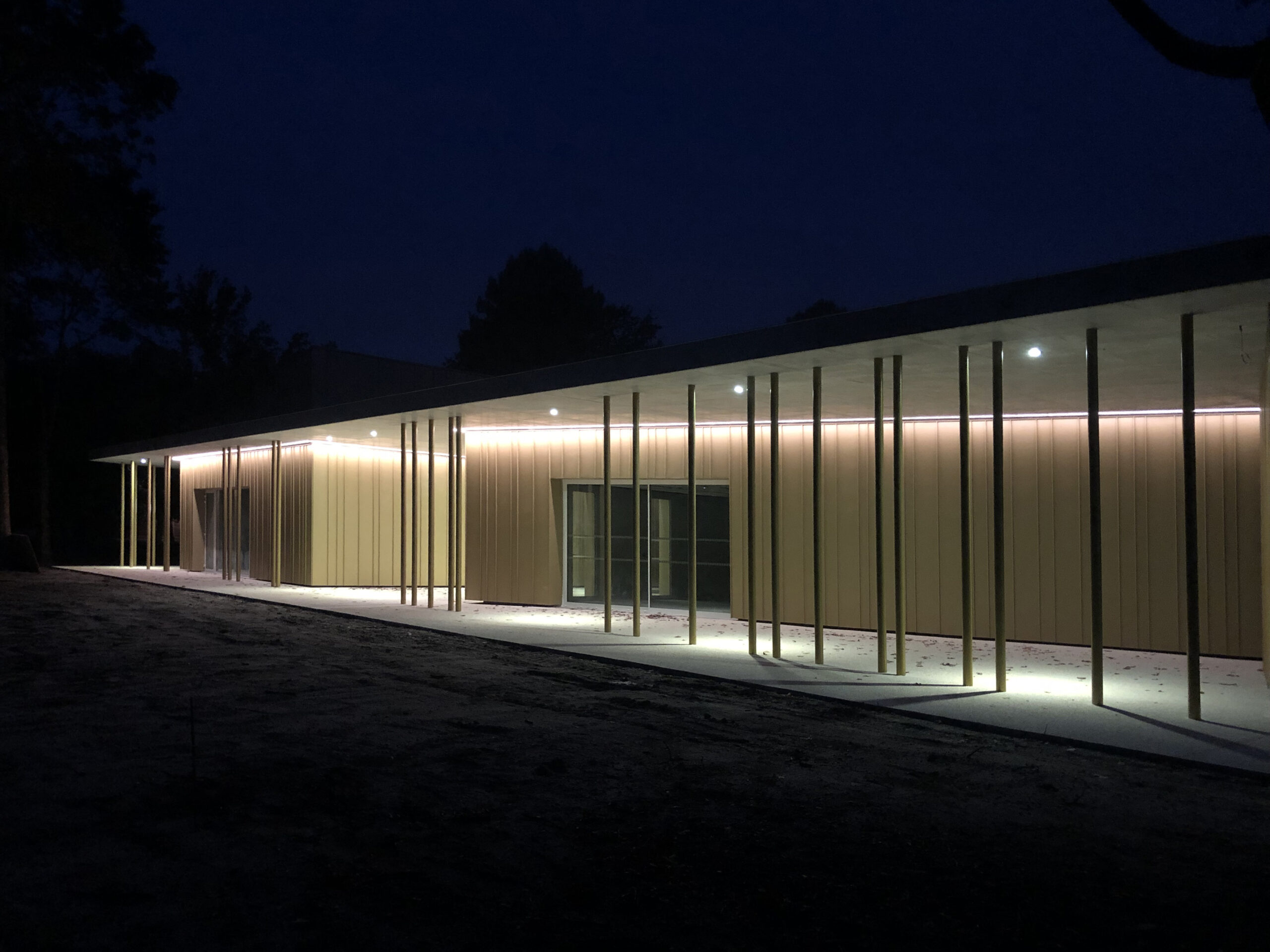 La silhouette du centre culturel se dessine progressivement au gré des essais d’éclairage. Réalisation par BPM Architectes, agence d’architecture sur Bordeaux centre.