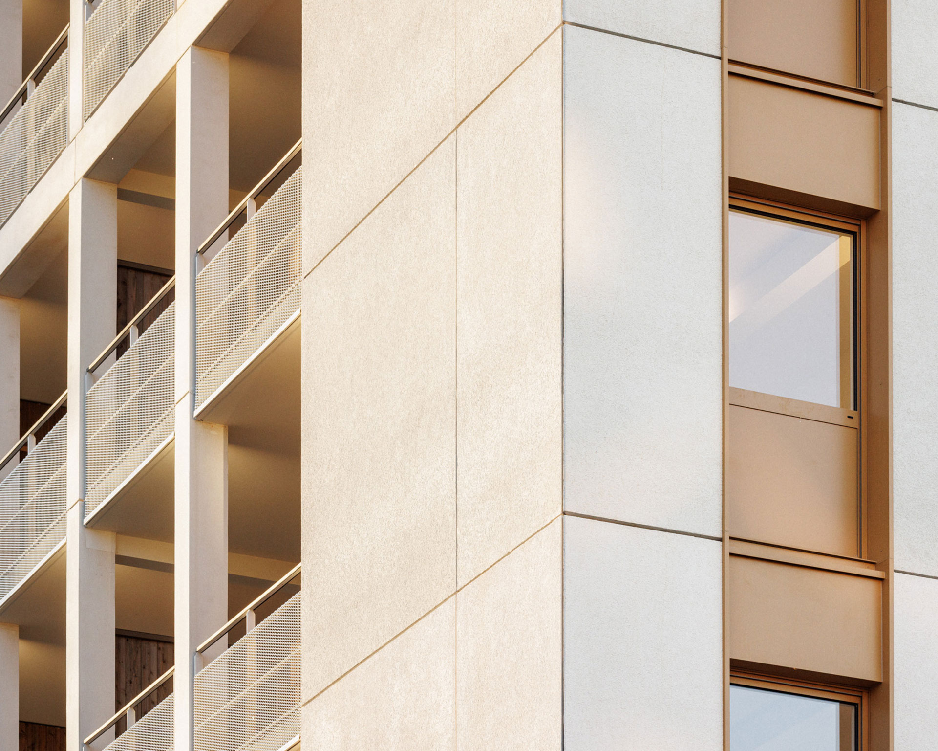Le projet de paysage est conçu en lien étroit avec le projet architectural : il s’inscrit sur une logique de « reverdissement » des façades avec principalement un jardin sur dalle inaccessible au R+2 de la façade Ouest, et une plantation ponctuelle en pot pour chaque loggia.