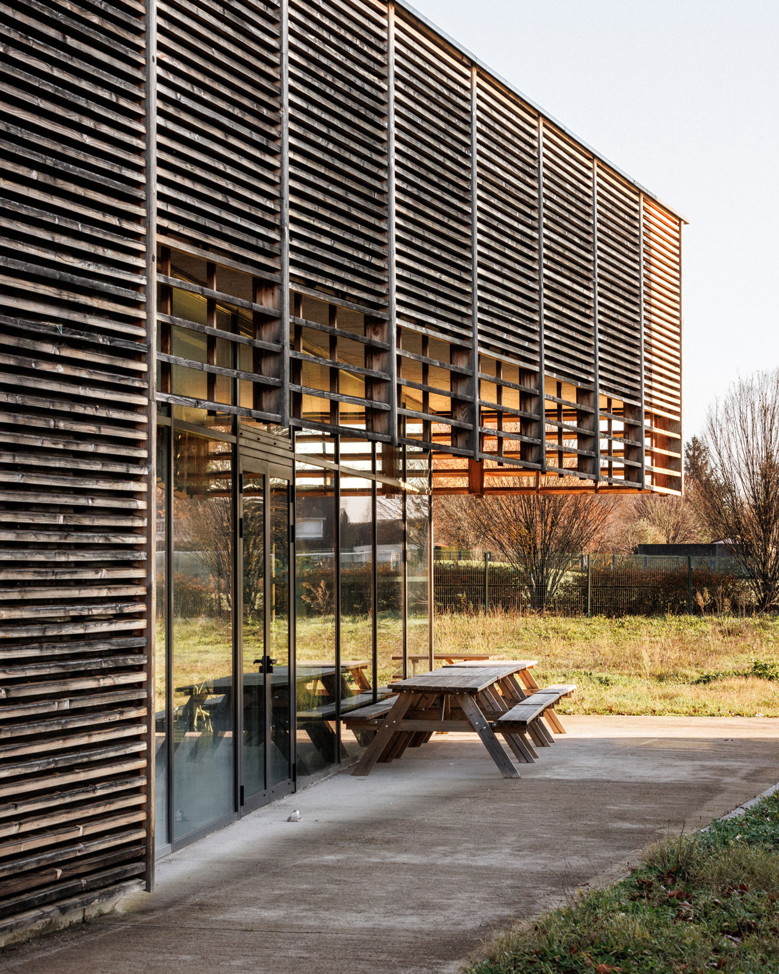L’extension accueille un pôle de restauration indépendant, pensé comme un équipement à part entière. Composé de deux volumes — un socle technique en béton et une structure bois largement vitrée — le bâtiment affirme une écriture contemporaine qui dialogue avec l’existant. Les façades ouvertes sur le paysage et la cour créent une continuité entre intérieur et extérieur, baignant les espaces de restauration de lumière naturelle.
