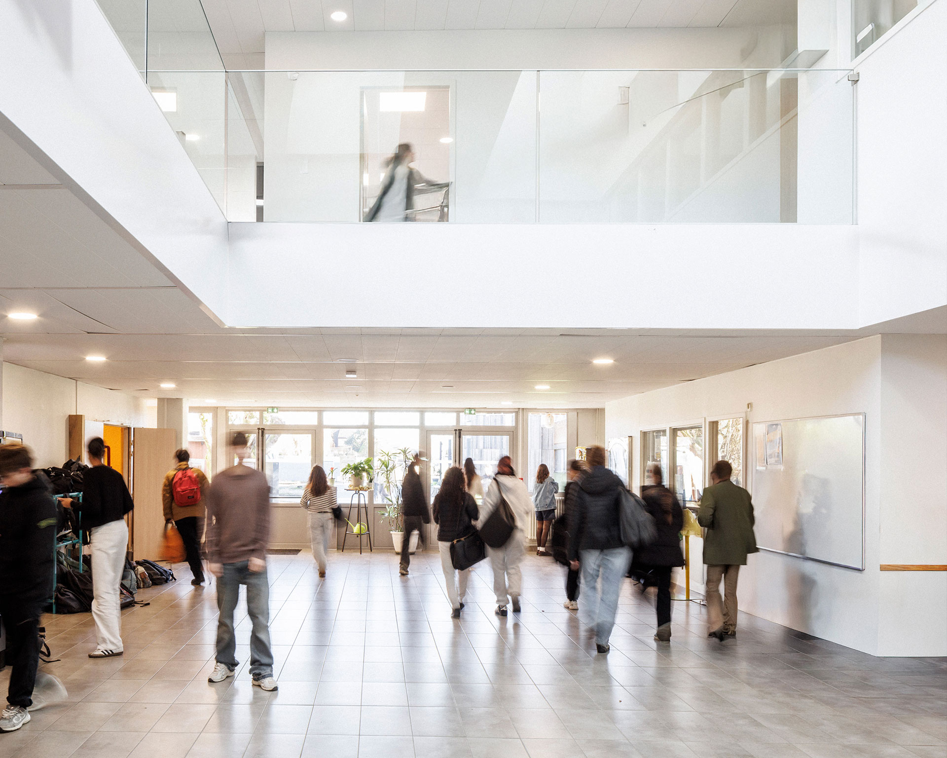 La restructuration du bâtiment d’enseignement conserve les volumes existants tout en redéployant entièrement les espaces intérieurs. Le nouveau hall d’accueil devient un véritable cœur de vie : double hauteur, lumière zénithale et transparences créent une respiration centrale qui structure l’ensemble des circulations. Autour de ce pivot se distribuent les pôles pédagogiques, la vie scolaire, les espaces administratifs et les lieux de convivialité.
