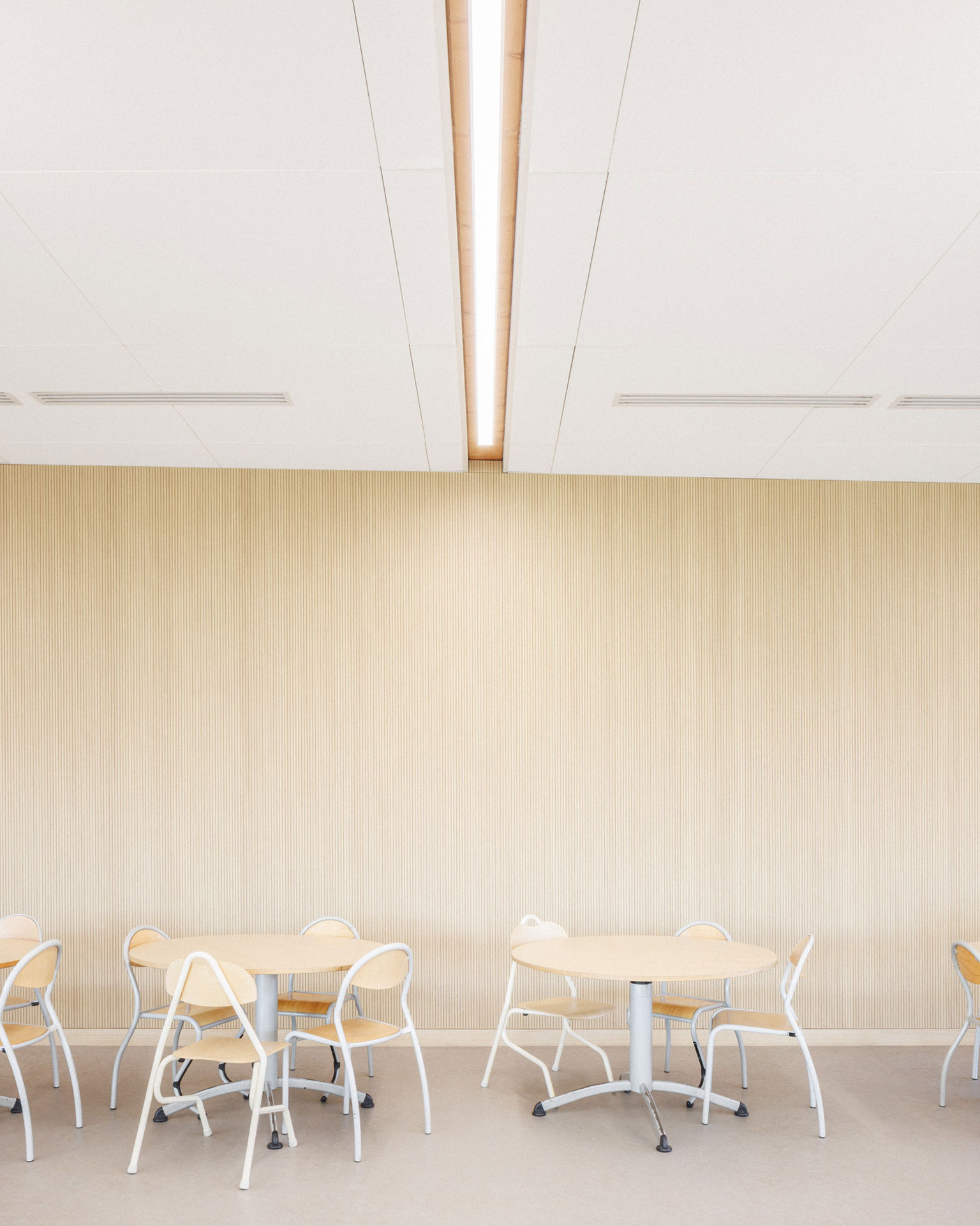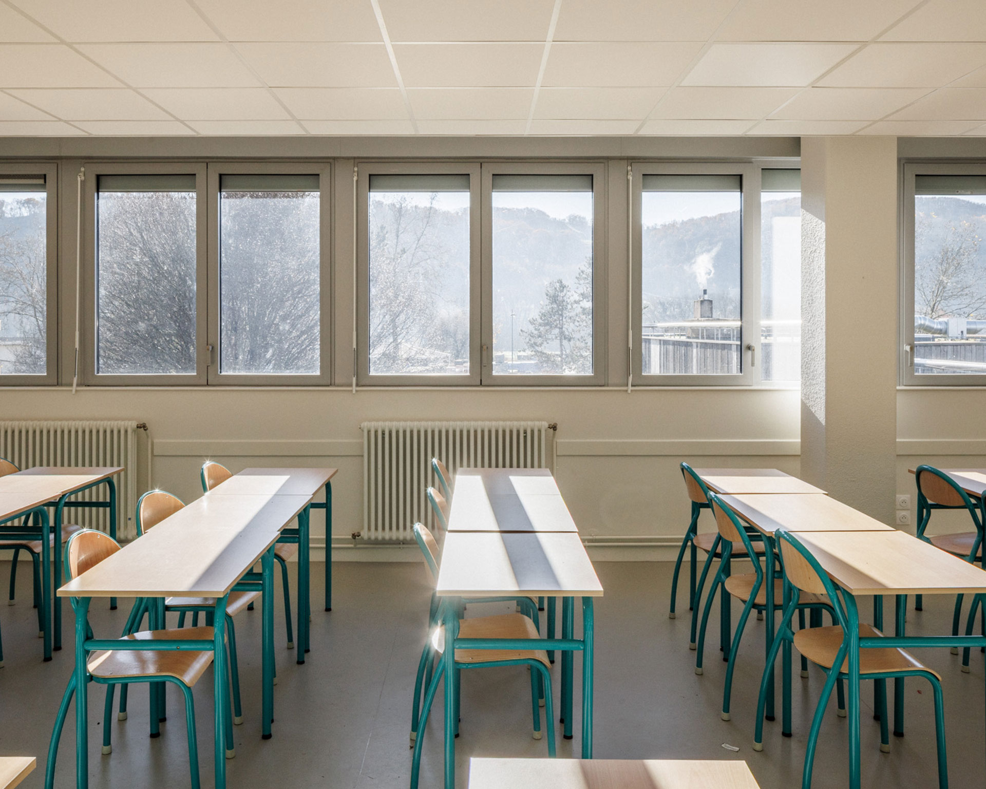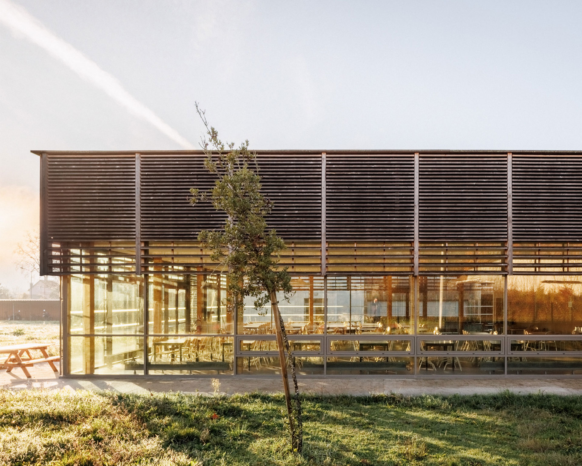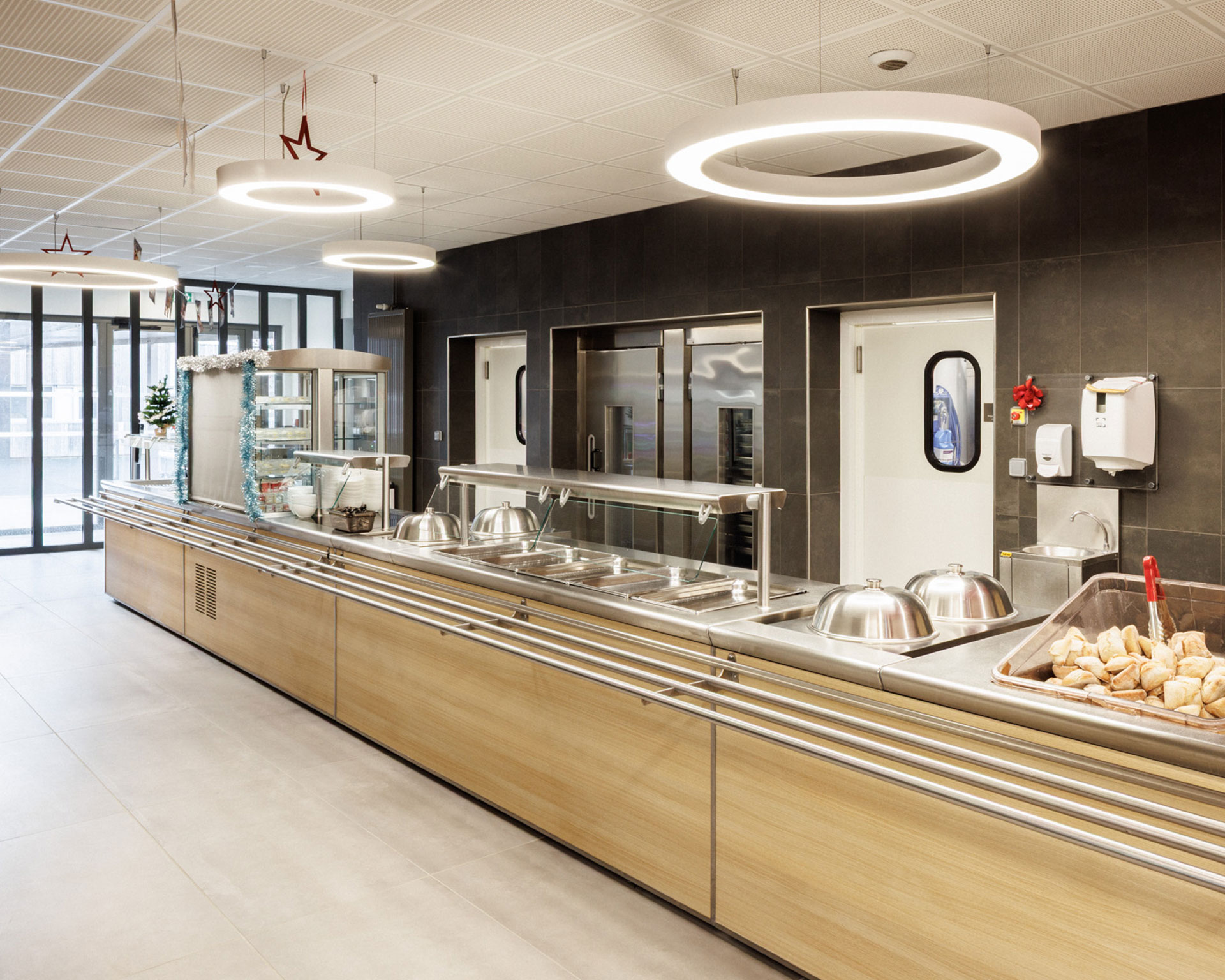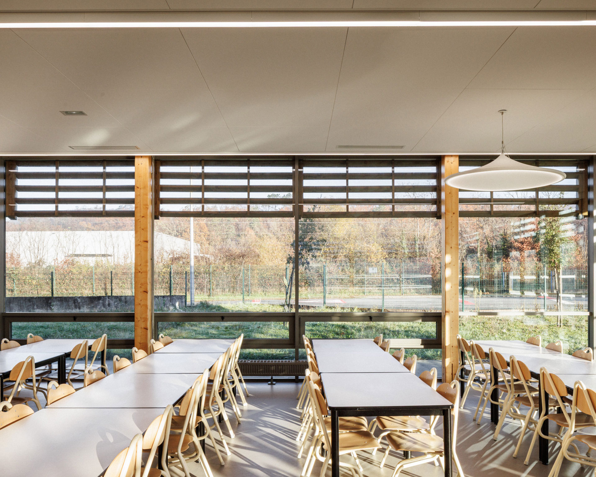 L’organisation intérieure distingue clairement les flux : production, service et parcours élèves fonctionnent de manière fluide et rationnelle, garantissant confort d’usage et efficacité logistique. Les dispositifs acoustiques, la protection solaire et les volumes généreux participent à une atmosphère calme et qualitative.