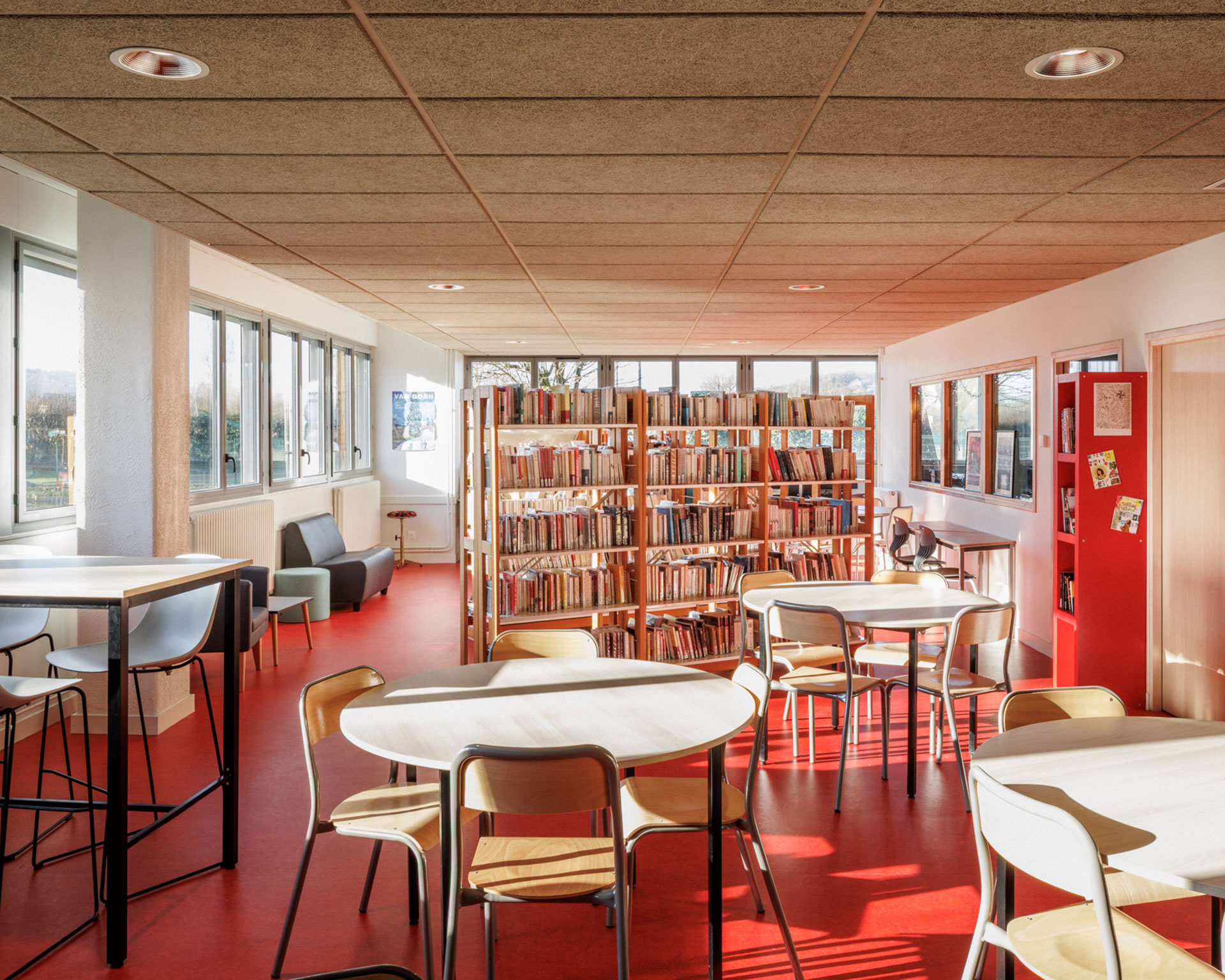 Cette nouvelle organisation favorise les échanges visuels, la lisibilité des parcours et une appropriation intuitive des espaces par les usagers. L’intervention vise également à améliorer les qualités acoustiques, thermiques et lumineuses afin d’offrir un environnement propice à l’apprentissage.