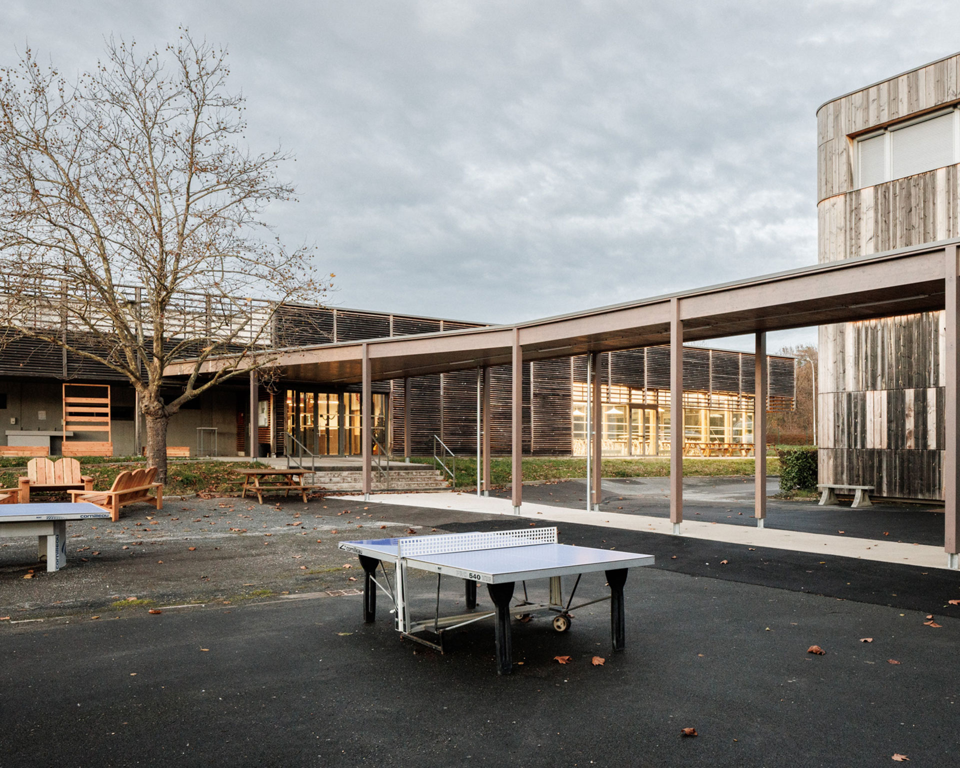Trois préaux viennent ponctuer le site et créer des lieux de transition protégés, reliés par des coursives couvertes. Ces interventions renforcent les continuités spatiales tout en offrant des zones de pause, d’attente et de sociabilité adaptées au rythme scolaire.
